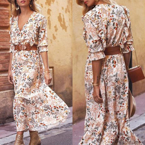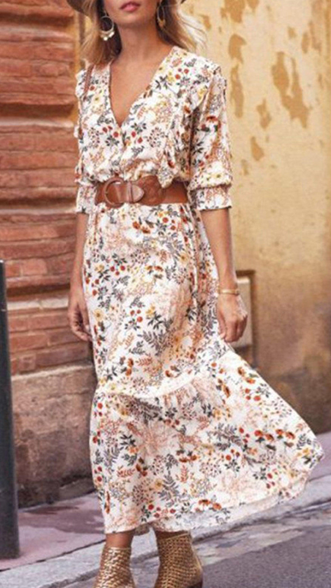 Fashion Floral Printed V-neck Short Sleeve Midi Dress