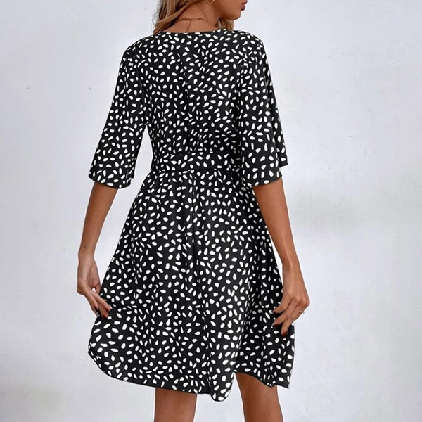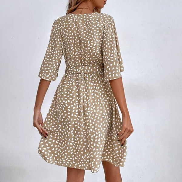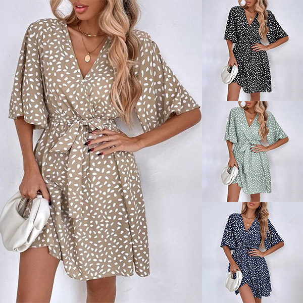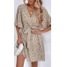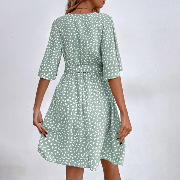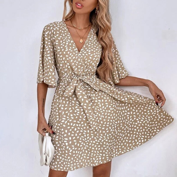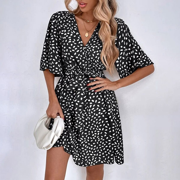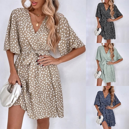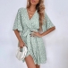 Fashion Floral Printed V-neck Short Sleeve Self-tie Mini Dress