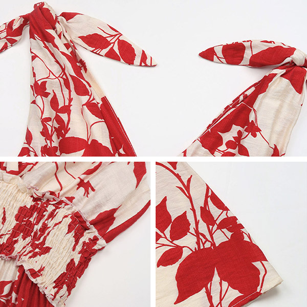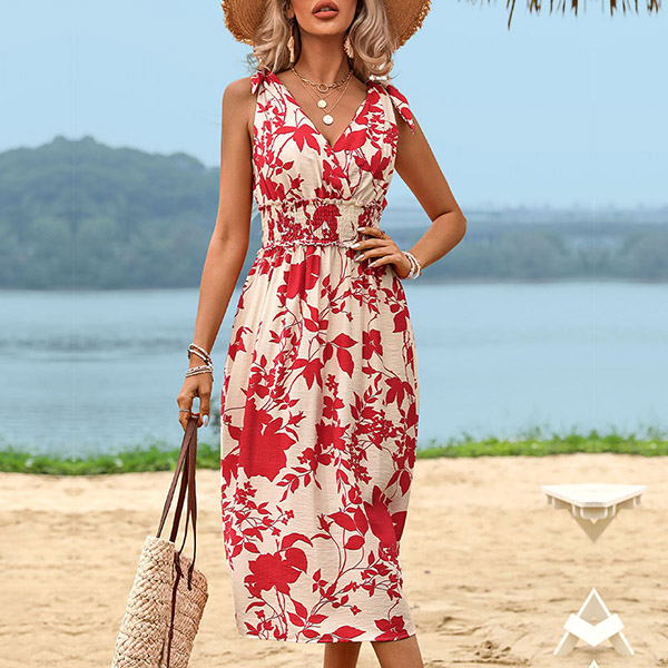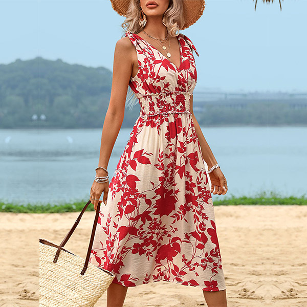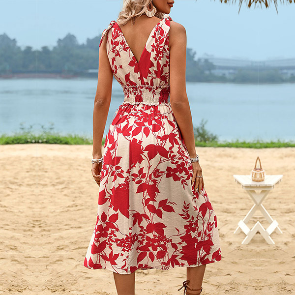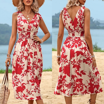 Fashion Floral Printed V-neck Sleeveless Elastic Waist Midi Dress
