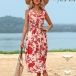 This fashionable dress features a vibrant floral print, a v-neckline, a sleeveless design, and an elastic waistband that creates a midi-length silhouette. Is it your style?