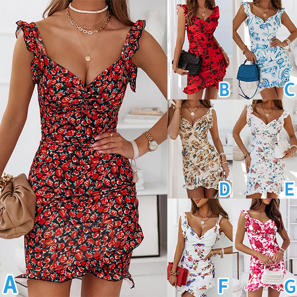 Fashion Floral Printed V-neck Sleeveless Iregular Hemline Bodycon Dress