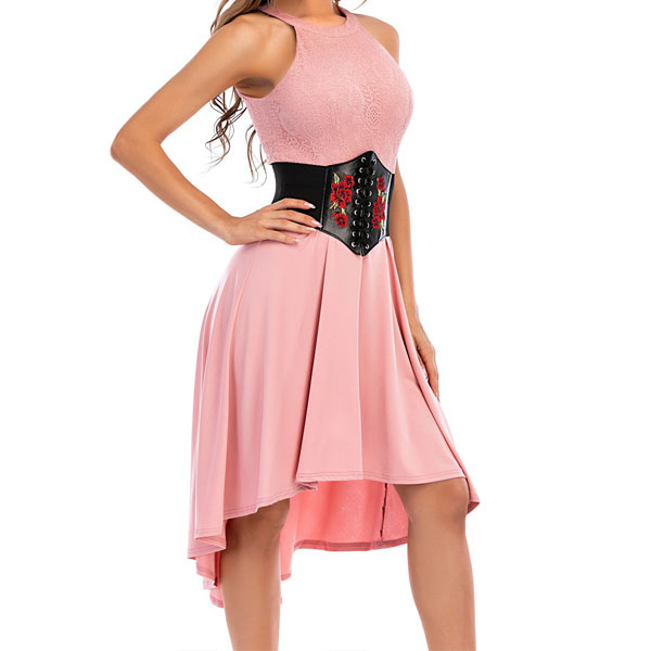 Fashion Flower Embroidery Lace-up PU Leather Girdle