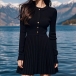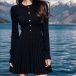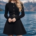 This black dress features classic front button styling with comfortable crew neck construction and dynamic pleated hemline for contemporary cozy elegance. Perfect for casual occasions, comfortable styling, or sophisticated cozy coordination.