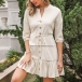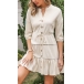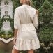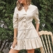 This fashionable dress features a front button closure, elbow-length sleeves, and a tiered skirt design, creating a unique and stylish silhouette that is perfect for a variety of occasions.