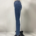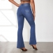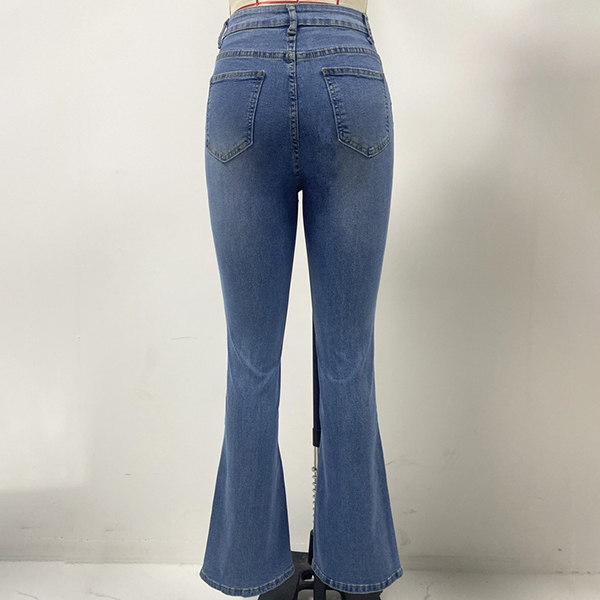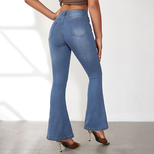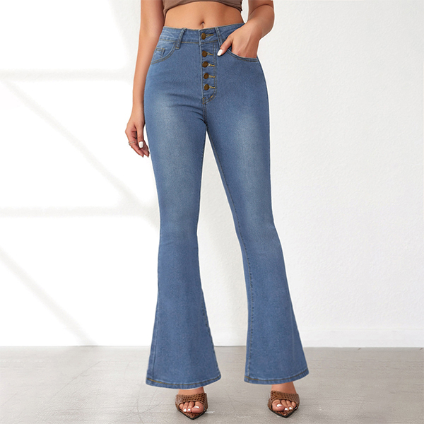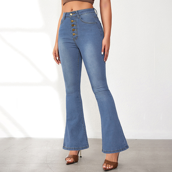 These fashionable denim jeans feature a high-rise waist, front button closure, flare silhouette, and old-washed finish, creating a chic and retro-inspired look. Pair them with a tucked-in blouse or a fitted top to showcase the high-rise waist and flare silhouette.