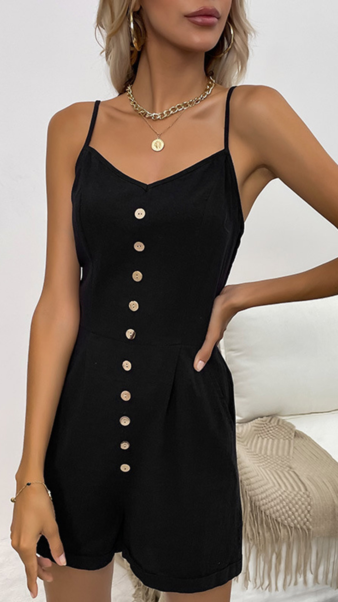 This stylish romper features a V-neckline with a front button design creating a chic, yet casual aesthetic. Hope you like it.