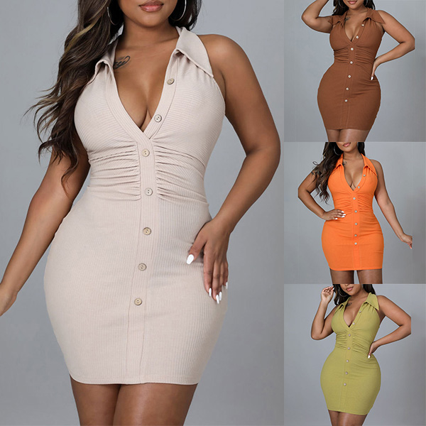 Crafted with high-quality and stretchy fabric, this bodycon dress hugs your curves in all the right places. It features a front button detail, a flattering V-neckline, a stand collar, and a bodycon silhouette, creating a stylish and elegant piece that is perfect for both formal occasions and evenings out.