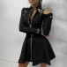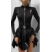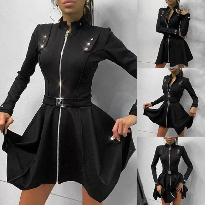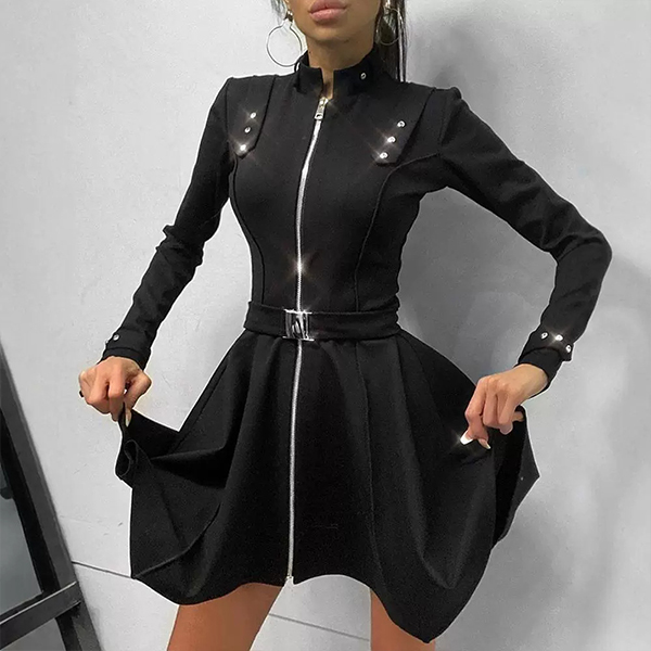 Fashion Front Zipper Buckle Mock Neck Long Sleeve Cinch Waist Mini Dress