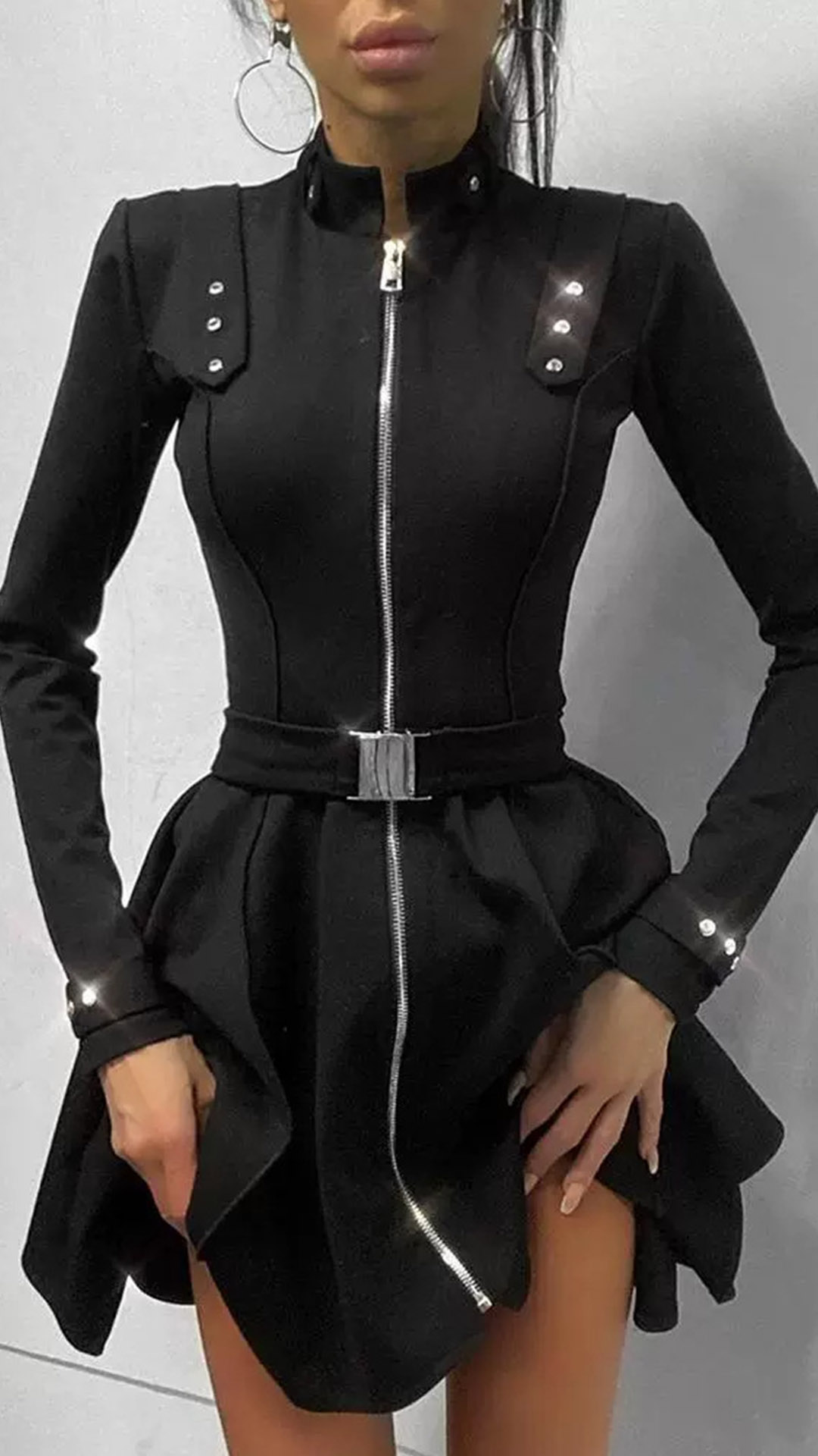 This black dress features a front zipper, buckle detailing along the shoulder and cuff, a mock neck, long sleeves, and a cinched waist, creating a stylish and trendy look. Style it with boots and a leather jacket for a more casual yet stylish look. Wanna have one?
