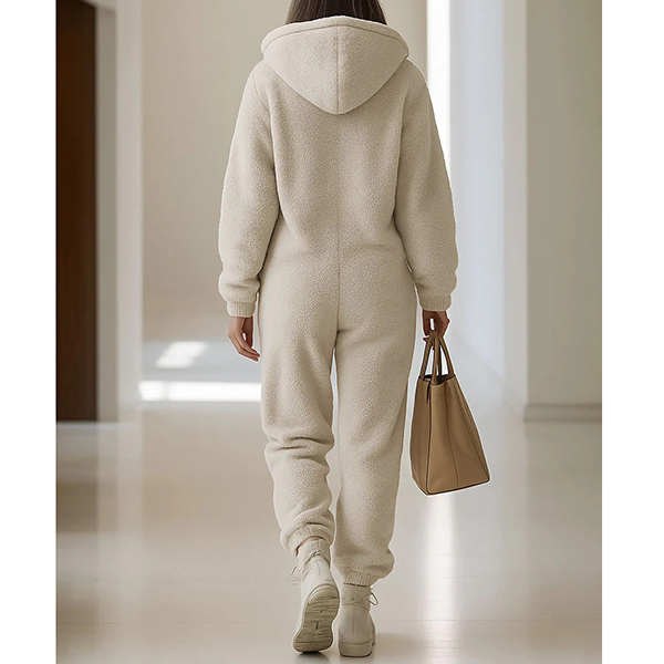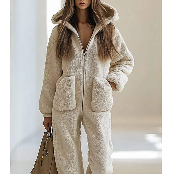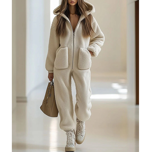 This luxurious one-piece combines ultimate comfort with functional design for elevated loungewear sophistication. The plush fabrication provides supreme softness and tactile richness that creates an indulgent wearing experience, while the front zipper closure delivers practical functionality and streamlined aesthetic appeal. The patch pockets add utilitarian charm and convenient storage that enhances the jumpsuit's casual accessibility, and the long sleeve coverage offers comprehensive warmth with relaxed fit that maintains effortless comfort throughout extended wear.Perfect for cozy home styling.