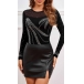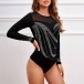 This is a glamorous and stylish bodysuit that combines gauze splicing, rhinestone embellishments, a round neckline, and long sleeves for a sexy and fashionable look. It can be paired with high-waisted pants, skirts, or jeans for a stylish and put-together outfit.