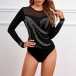 Fashion Gauze Spliced Rhinestone Round Neck Long Sleeve Slim Fit Bodysuit