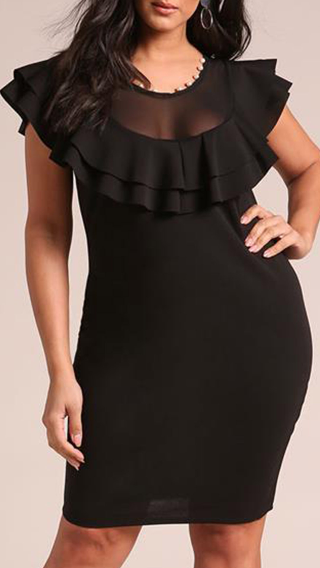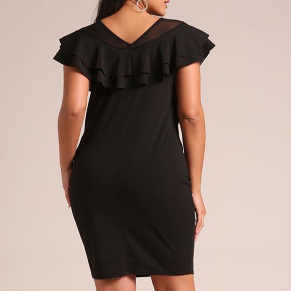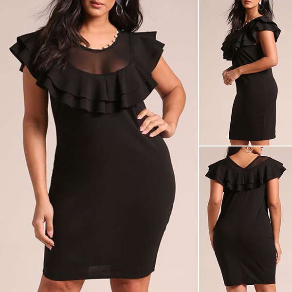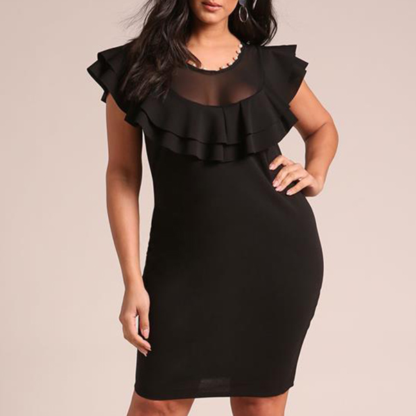 This is a fashionable plus-size bodycon dress with a round neckline and sleeveless design. It features a unique gauze splice detail that adds a touch of elegance and sophistication to the overall look. The ruffle detail creates a playful and feminine feel to the dress.Wanna have a try?