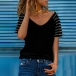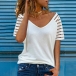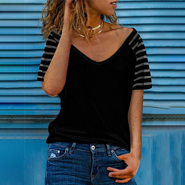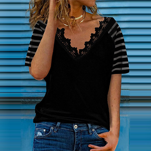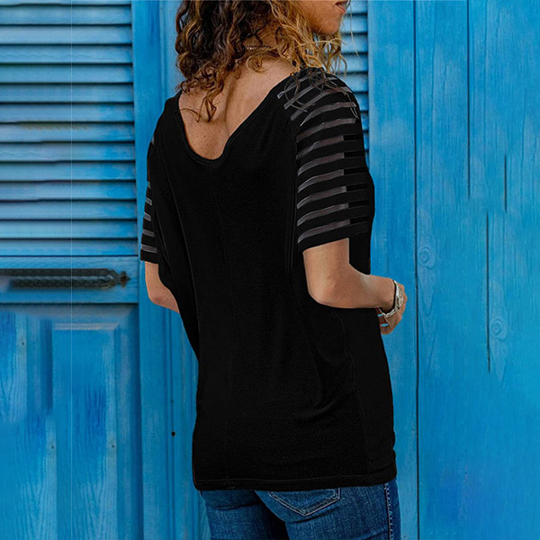 Fashion Gauze Spliced Short Sleeve V-neck Loose T-shirt