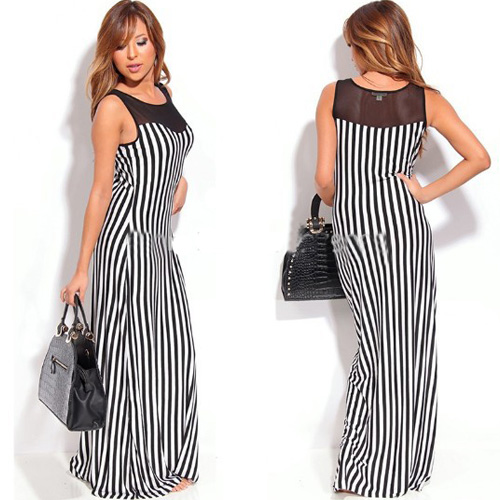 Striped all over for a summery, nautical look and sleek in its maxi length and round-neck design,