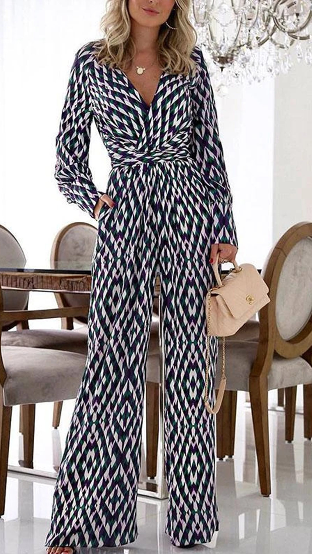 With its fun and eye-catching geometric print, this jumpsuit will be sure to turn heads wherever you go. The wide-leg silhouette and V-neck cut provide a flattering fit and a stylish look. The long sleeves keep things comfortable and the lightweight fabric ensures you stay cool and comfortable all day. Perfect for the office, a night out, or just lounging around the house, this jumpsuit is sure to become a go-to favorite in your wardrobe.