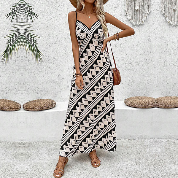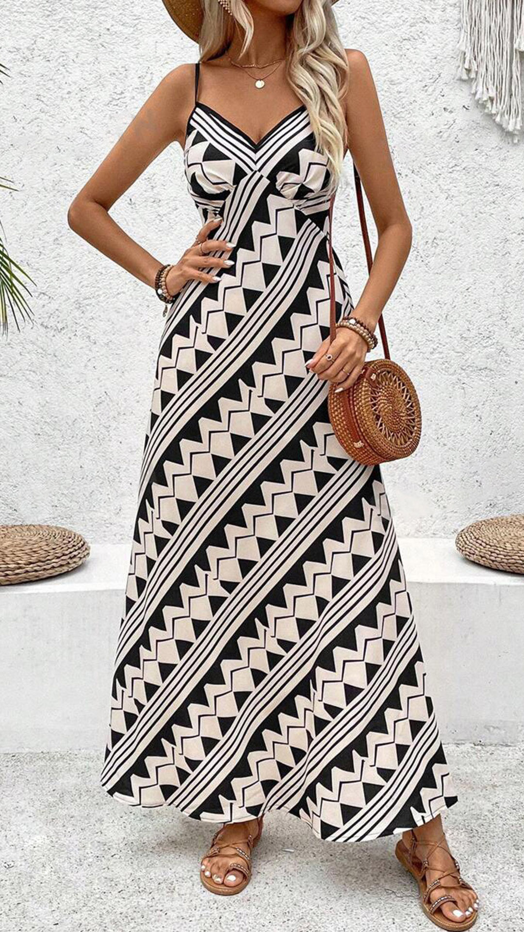 This maxi dress features an overall geometric print design, a flattering V-neckline, a smocked back for a perfect fit, and a backless feature for an eye-catching and stylish look. Is it your style?