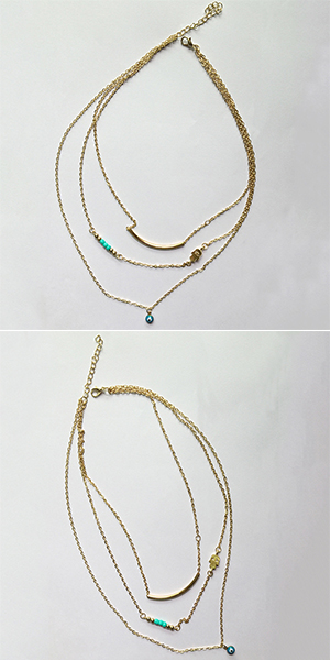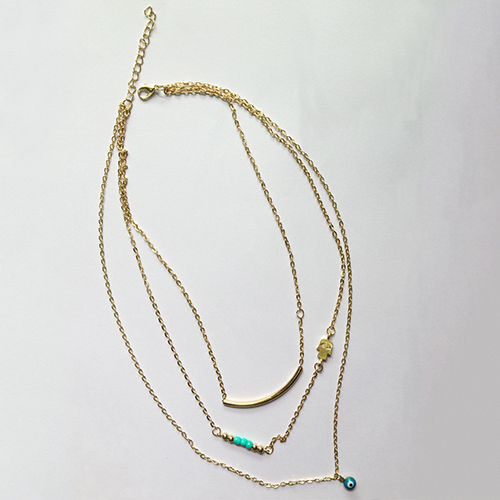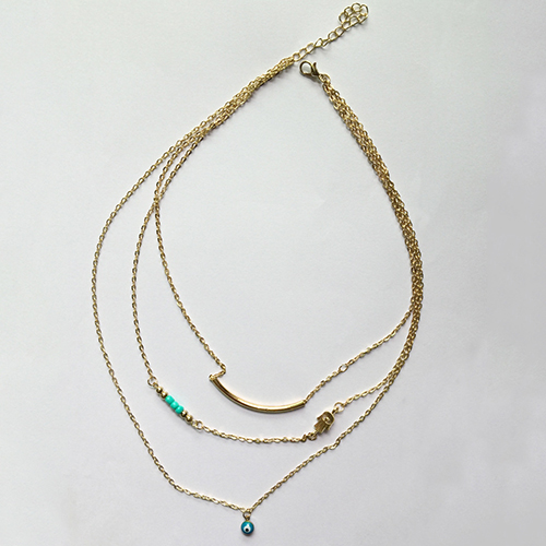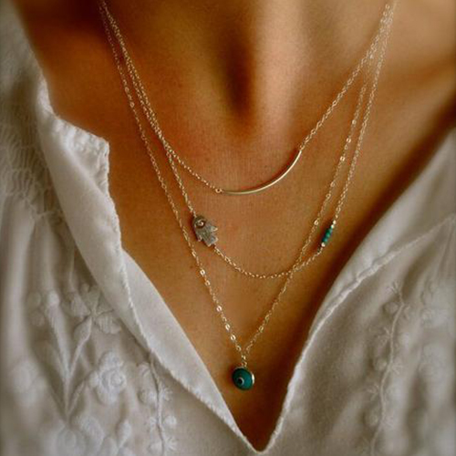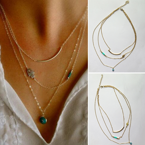 The pendant necklace is styled with geometric shaped design and multilayer patterns, stereo