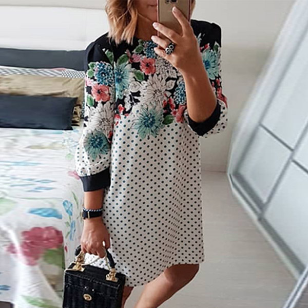 Bright up your day with a delightful dress such as this piece. The printed spliced details and dots design make this piece look more stylish and attractive. Finished with half sleeve,round neck and a loose silhouette,this dress not only can give you a comfortable day,but also can exude your style and personality.