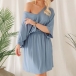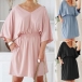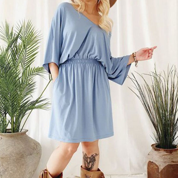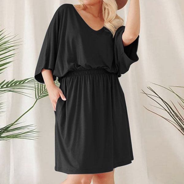Fashion Half Sleeve V-neck Elastic Waist Solid Color Dress