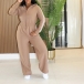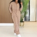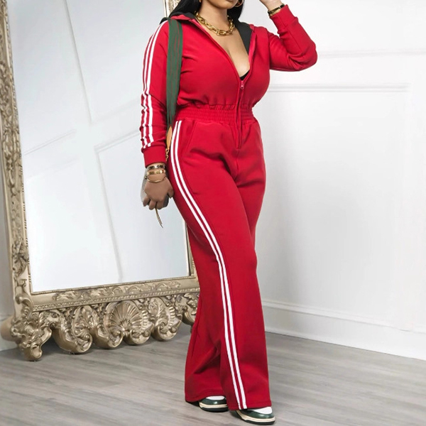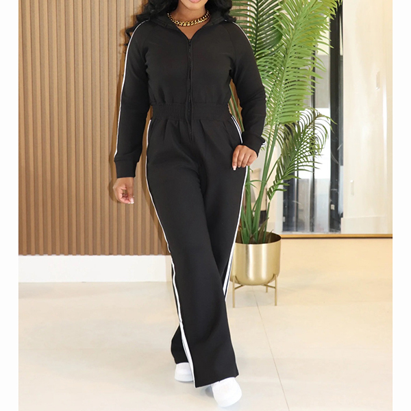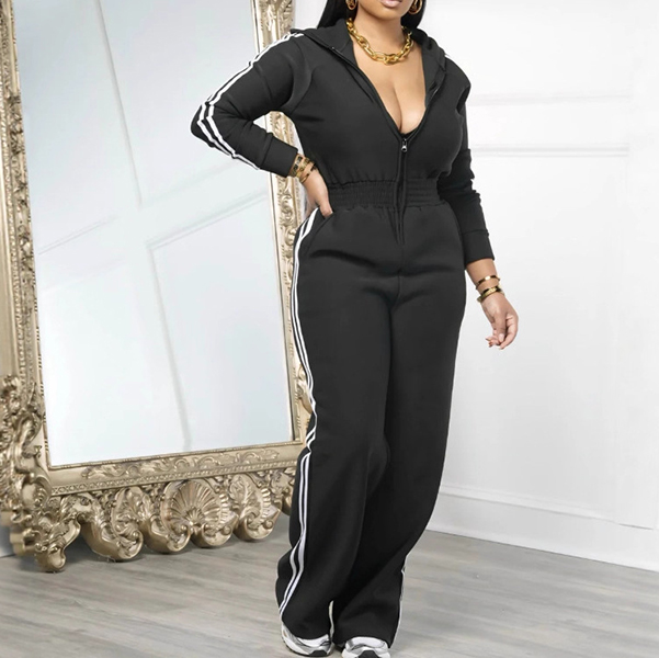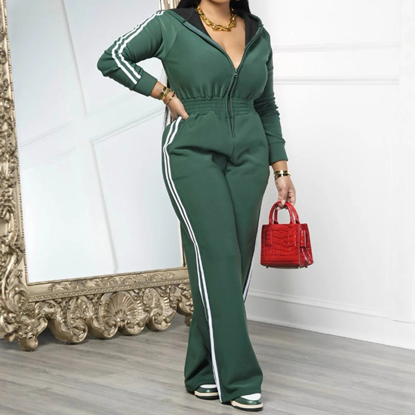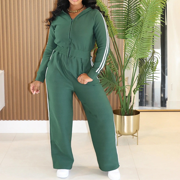 Fashion Half-zip V-neck Elastic Waist Straight-cut Hooded Jumpsuit