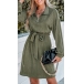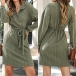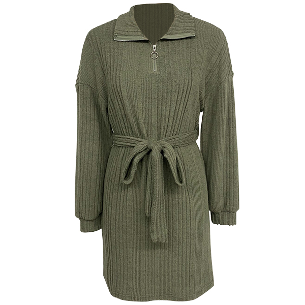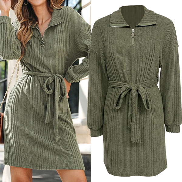 Fashion Half-zip V-neck Long Sleeve Self-tie Ribbed Dress