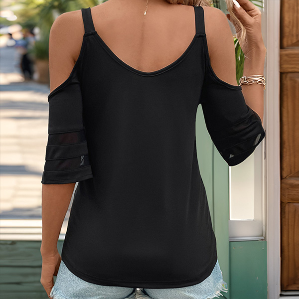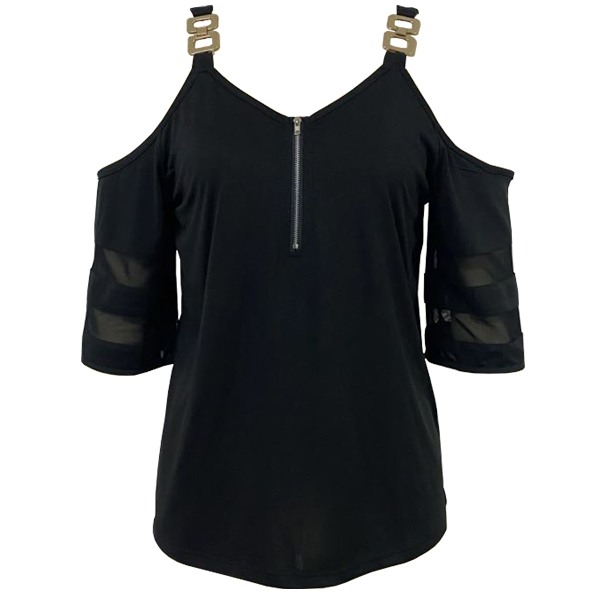 Fashion Half-zip V-neck Open-shoulder Short Sleeve Mental Shoulder Strap Shirt