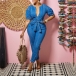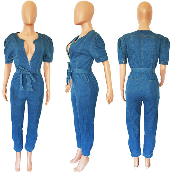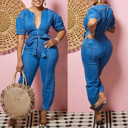 Fashion Half-zip V-neck Short Sleeve Self-tie Denim Jumpsuit