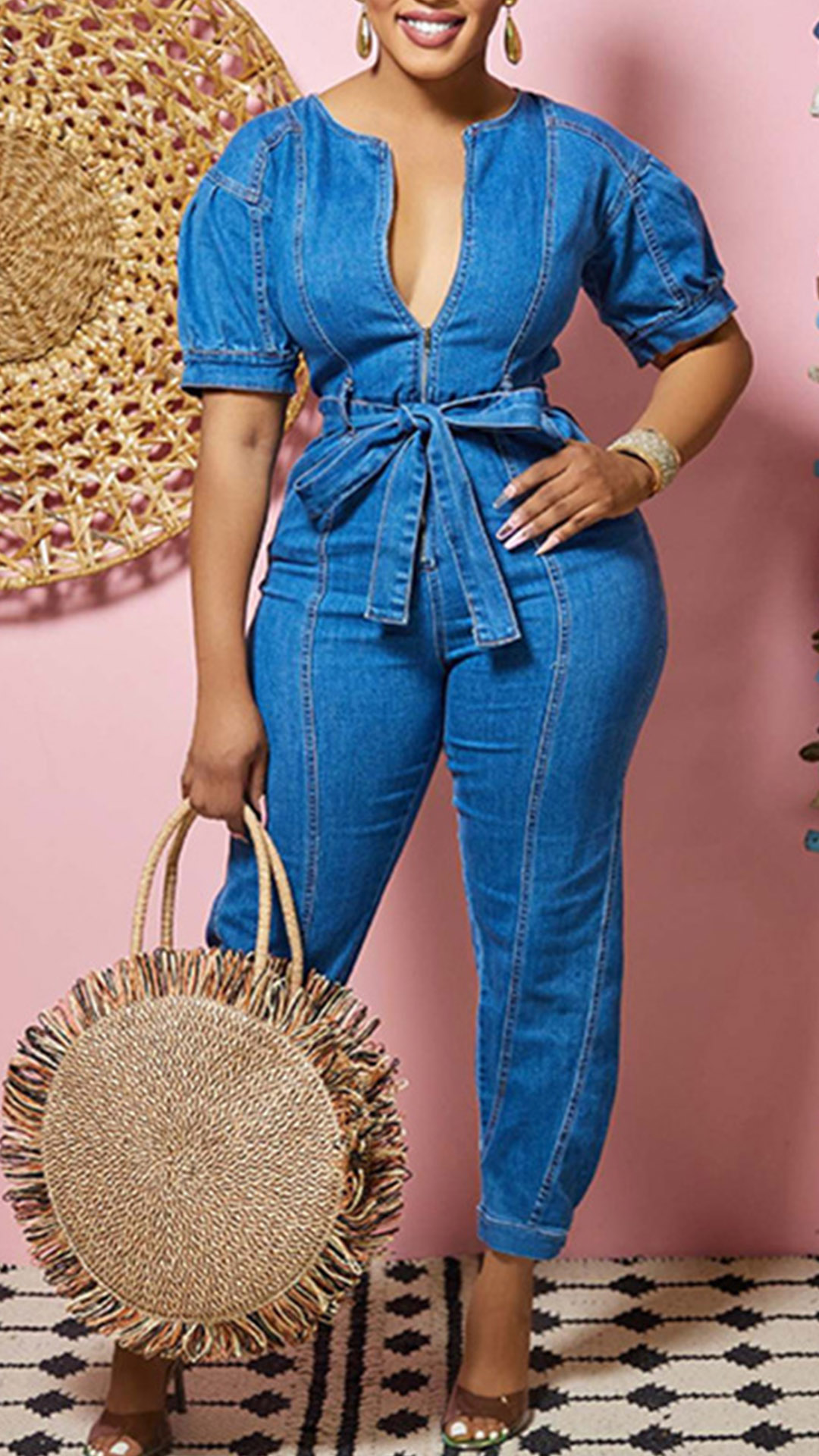 This Denim Jumpsuit is a stylish and versatile garment that is perfect for any casual occasion. The jumpsuit features a half-zip front with a V-neckline that adds a touch of sophistication to the denim fabric. The short sleeves provide a comfortable fit, while the self-tie waist cinches in at your natural waistline to create a flattering silhouette. The denim fabric is durable and easy to care for, making this jumpsuit a great choice for everyday wear. Wanna have one?