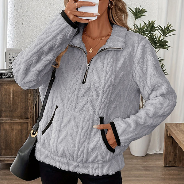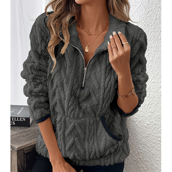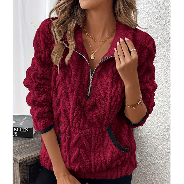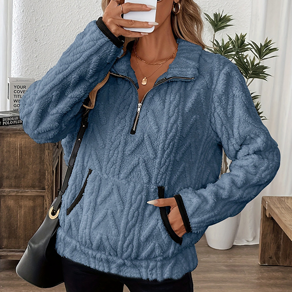 This cozy sweatshirt features luxurious plush fabric with contemporary half-zipper styling and practical kangaroo pockets for ultimate comfort. The soft plush material brings exceptional warmth whilst the half-zipper offers adjustable ventilation and modern sporty appeal. Perfect for lounging, casual outings, or comfortable weekend wear.