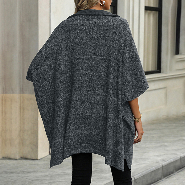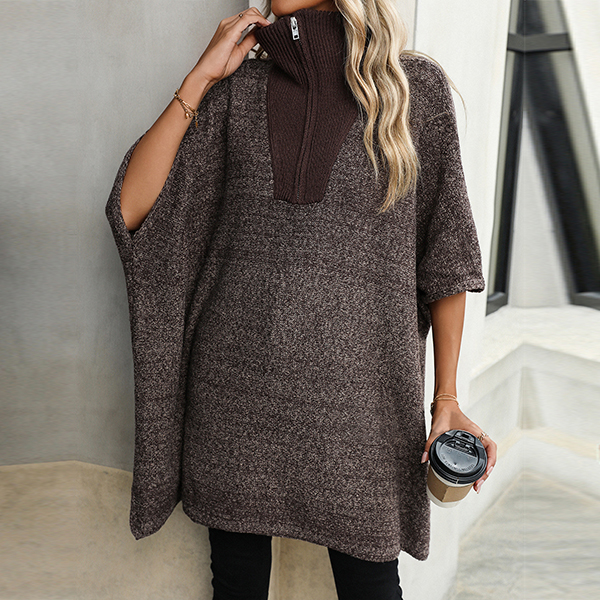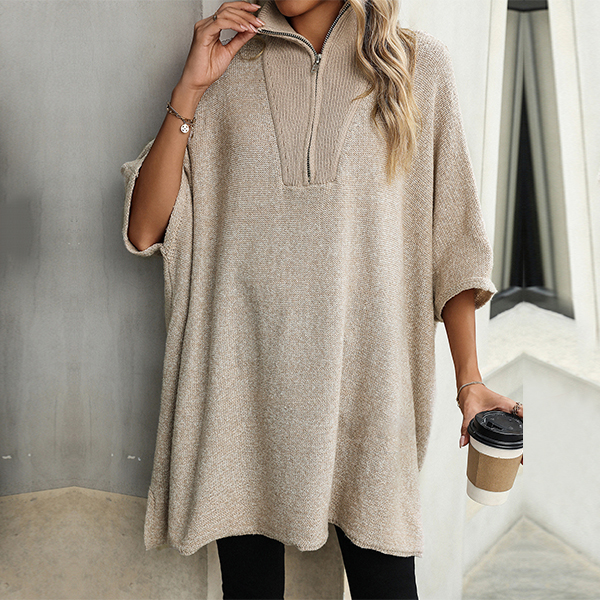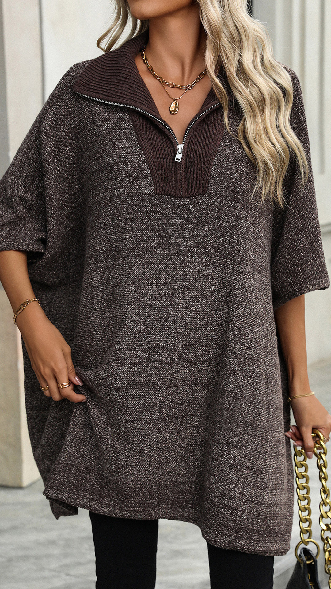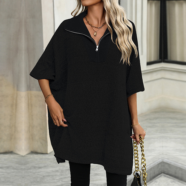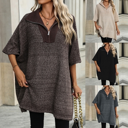 Stay cozy and stylish in this Knitted Sweater. This trendy sweater features a unique half-zipper design and lapel V-neckline that adds a touch of modern flair to your look. The batwing short sleeves offer a relaxed and comfortable fit, perfect for layering over a camisole or tank top. Whether you pair it with jeans for a casual outing or dress it up with a skirt for a more polished look, this sweater is versatile and fashionable.
