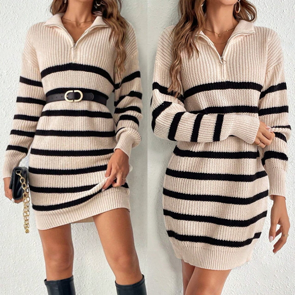 Make a statement with this eye-catching striped sweater dress that combines sporty functionality with feminine charm. The trendy half-zipper neckline offers styling versatility - zip it up for a polished athletic-inspired look or leave it partially open for a more casual, relaxed feel. The classic stripe pattern adds visual interest and a playful touch while creating a flattering elongating effect. The timeless stripe design makes it easy to accessorize and style for various occasions. Pair it with white sneakers and a denim jacket for a sporty weekend look~