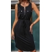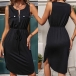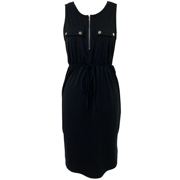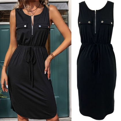 This dress combines trendy elements such as a half-zipper detail, a round neckline, a sleeveless design, a drawstring waist, and a slit, creating a fashionable and versatile ensemble. Pair it with strappy sandals and a statement bag for a casual daytime look.