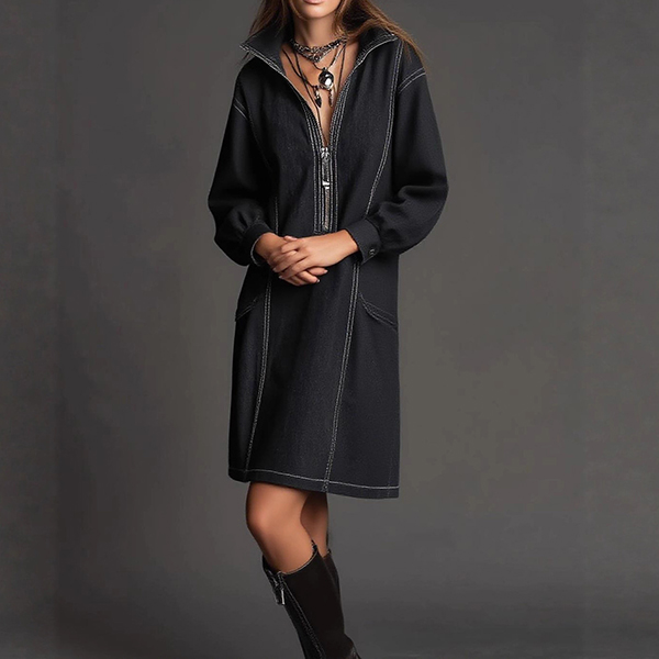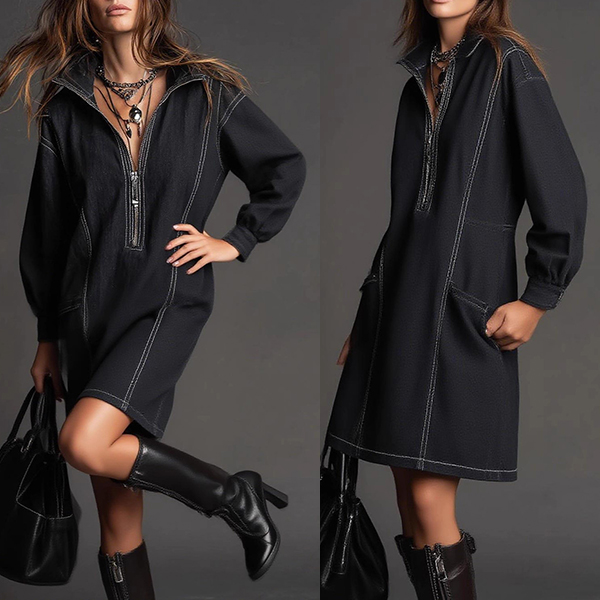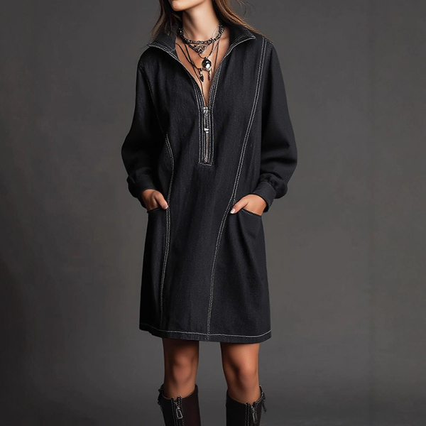 This relaxed denim dress merges casual comfort with structured design elements.The half-zipper creates adjustable neckline styling with sporty functionality, while the side pockets offer practical storage with utilitarian charm. Perfect for daily wear.