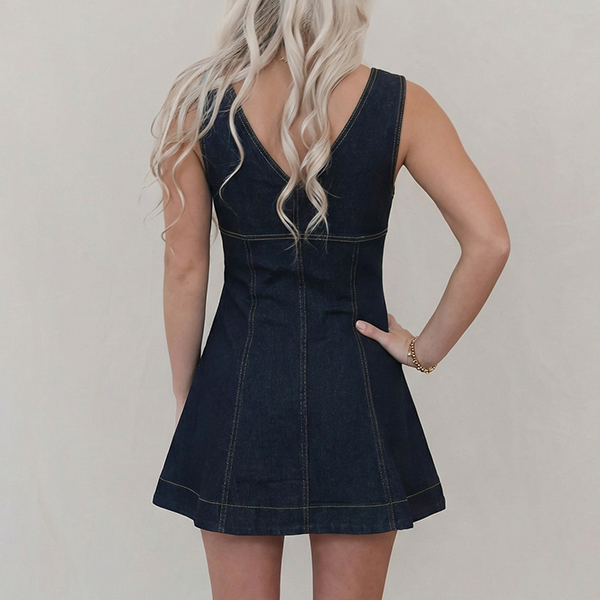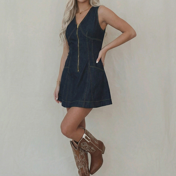 Fashion Half-zipper V-neck Sleeveless Old-washed Denim Dress