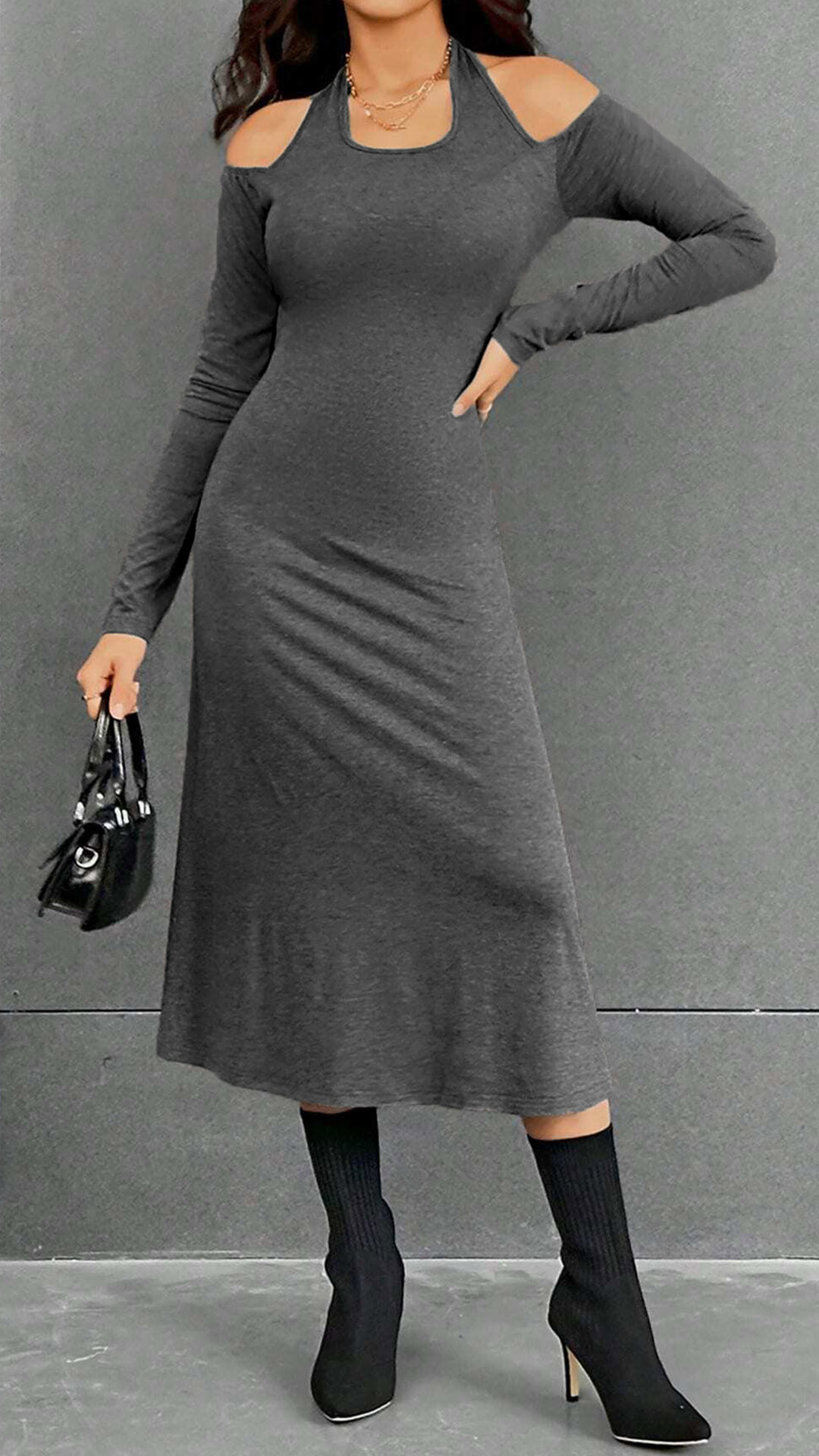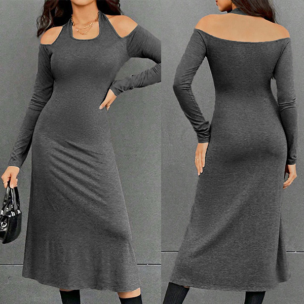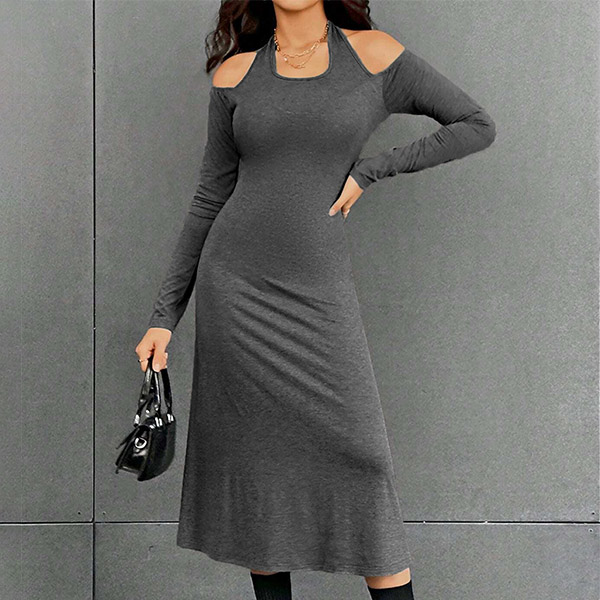 I like this gray dress! The halter neck design adds a chic and sophisticated touch, while the open-shoulder detail adds a flirty and alluring element. Pair it with strappy heels and statement earrings for a glamorous and chic ensemble!