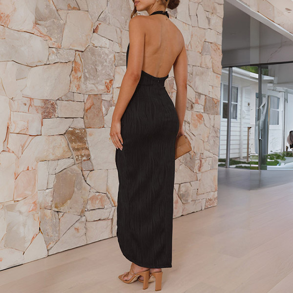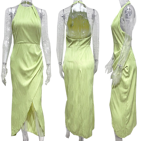 This dress features a halter neck, sleeveless design, and an irregular slit hemline for a fashionable and eye-catching look. Crafted from high-quality and lightweight fabric, this dress ensures both comfort and style.