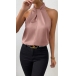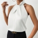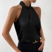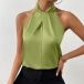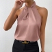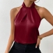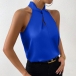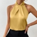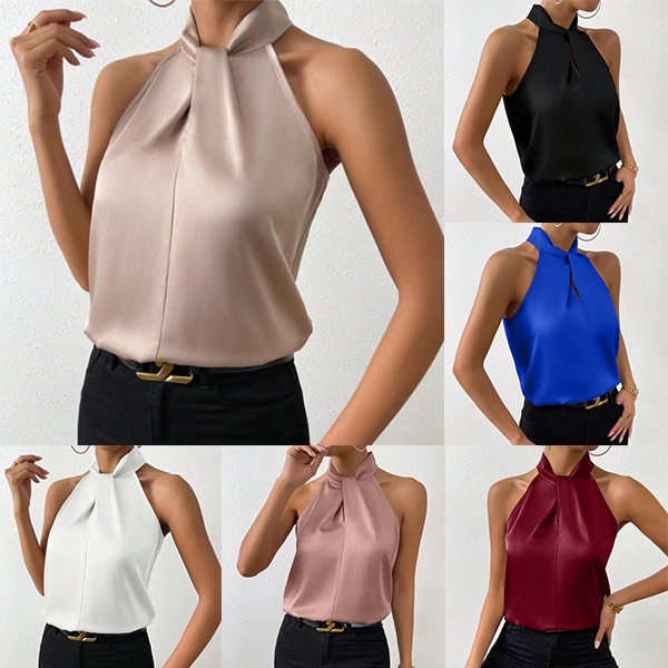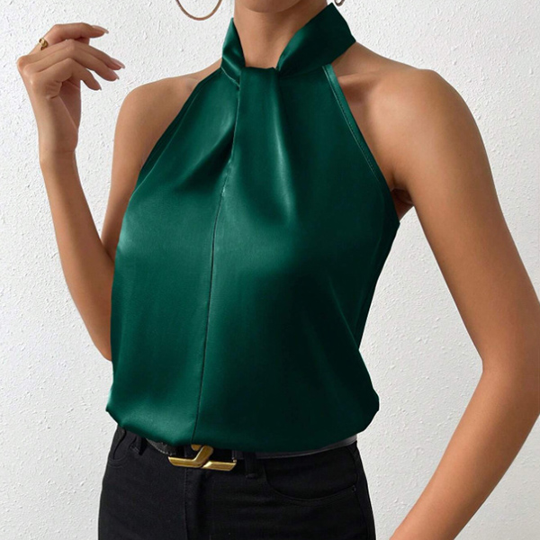 This fashionable satin shirt features a halter neckline, sleeveless design, and a luxurious satin fabric, creating a chic and sophisticated look. Pair it with trousers or a skirt for a polished and sophisticated look.