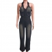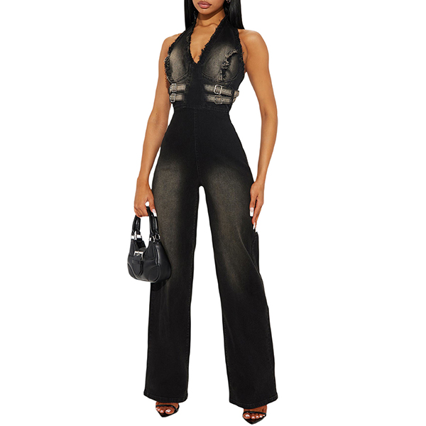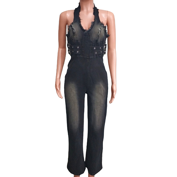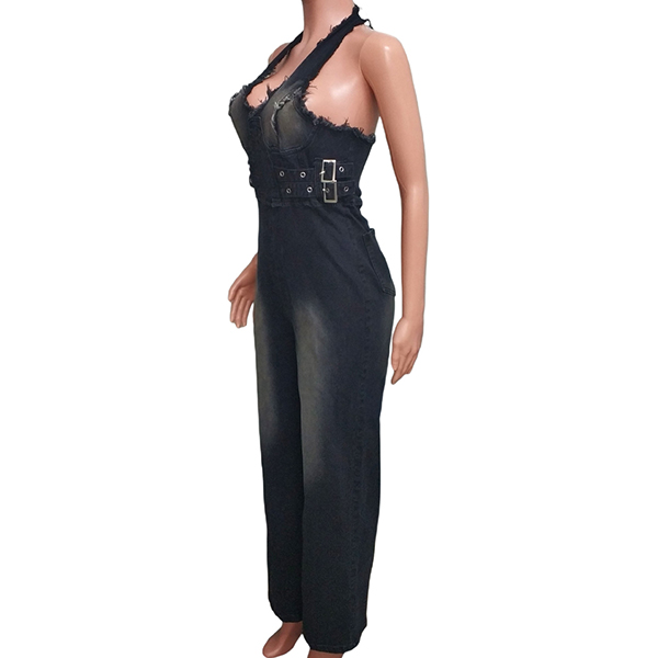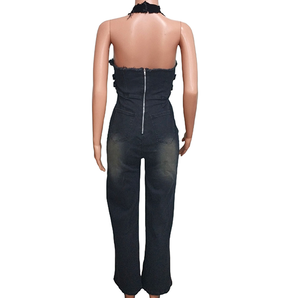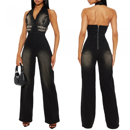 Fashion Halter Neck V-neck Backless Buckle Straight-cut Old-washed Denim Jumpsuit