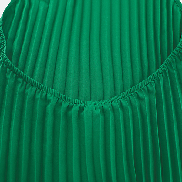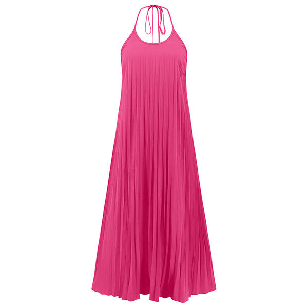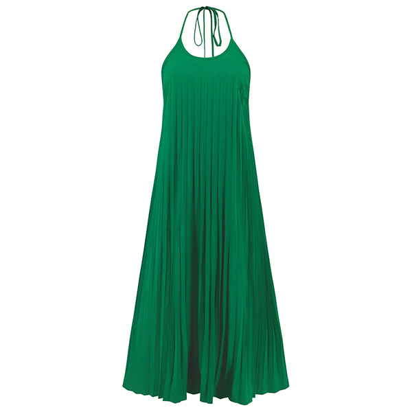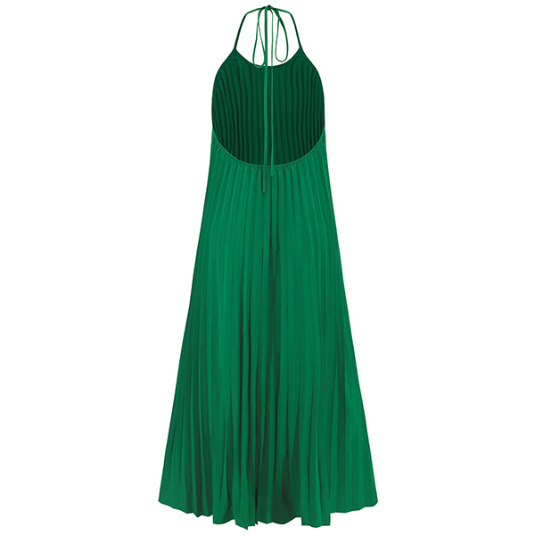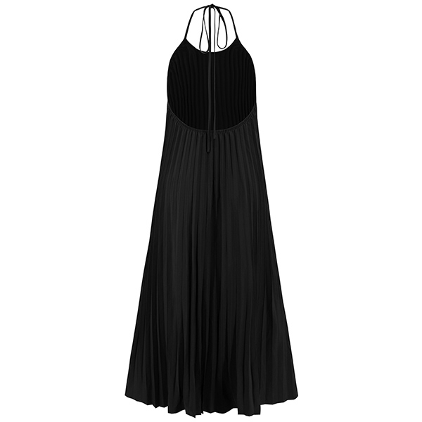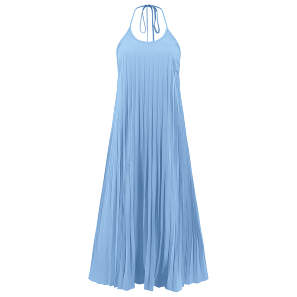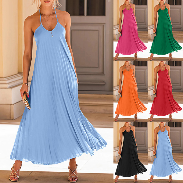 Look at this dress. Complementing the halter design, the pleated skirt of this maxi dress offers a dramatic, flowing quality. The knife-pleated fabric cascades elegantly to the floor, creating a soft, romantic movement with every step. Hope you like it.
