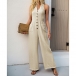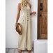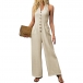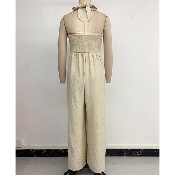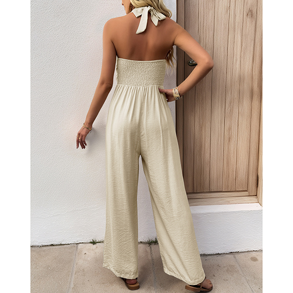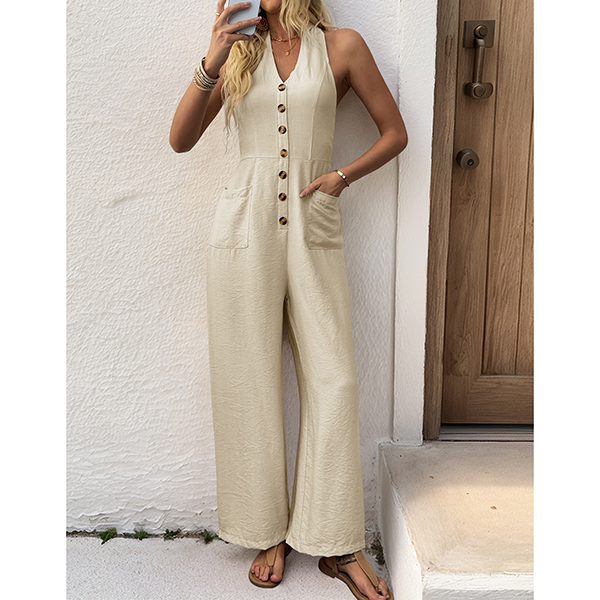Fashion Halterneck V-neck Front Button Patch Pockets Backless Straight-cut Jumpsuit