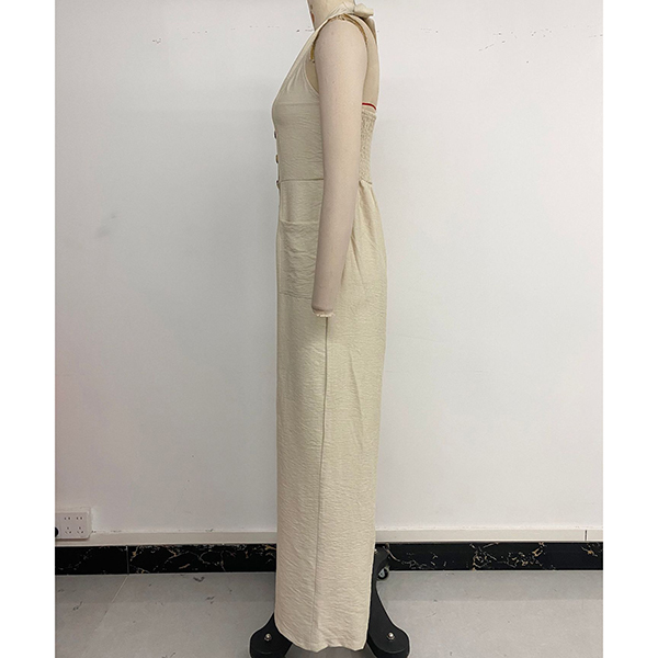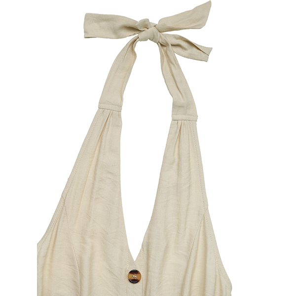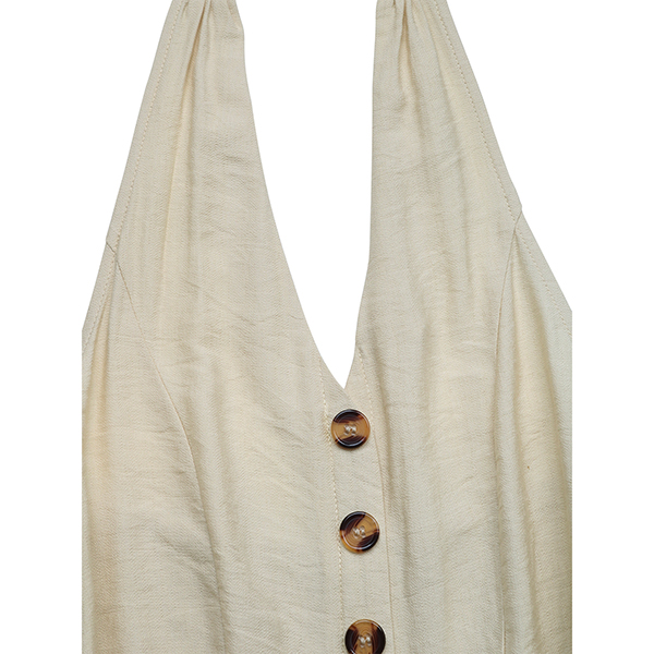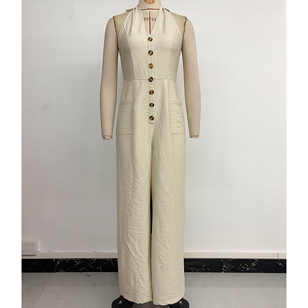 This jumpsuit features confident halterneck styling with elegant V-neck construction and classic front button design for contemporary structured elegance. Perfect for daily wear.