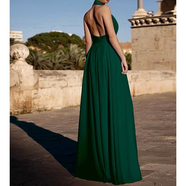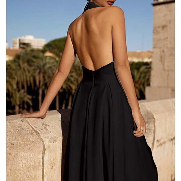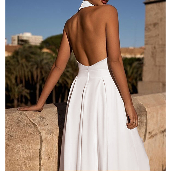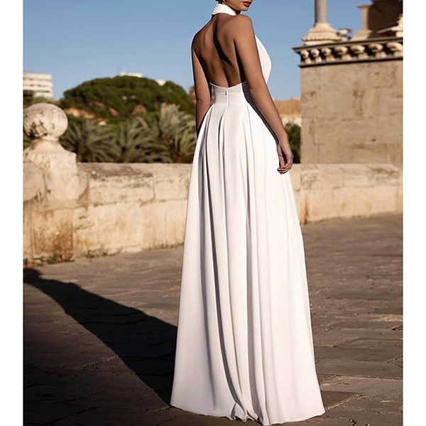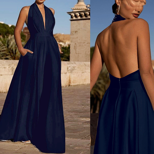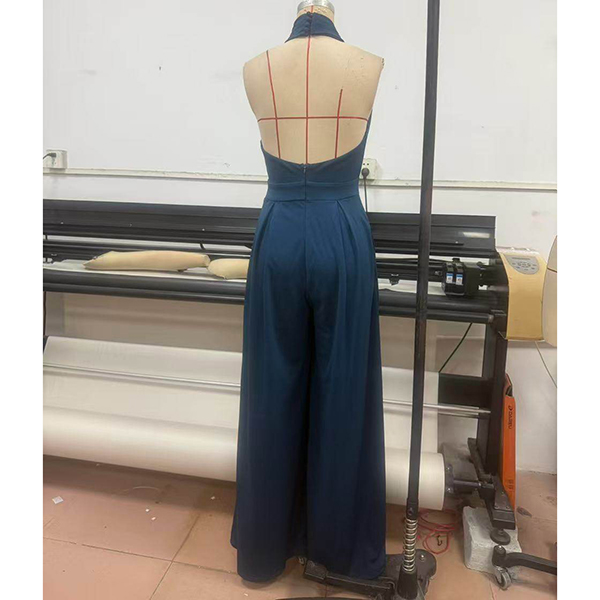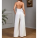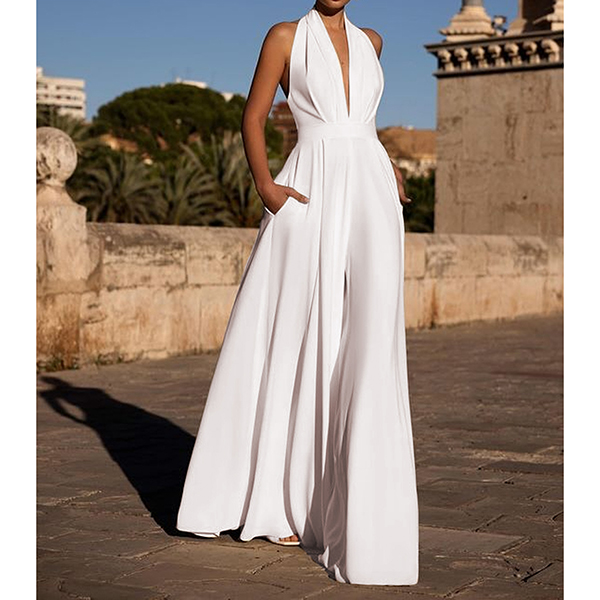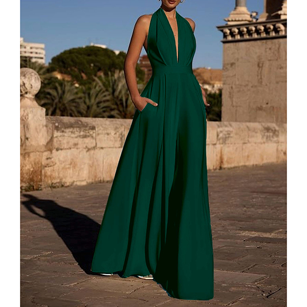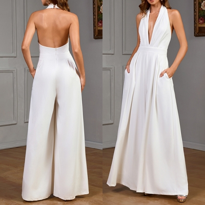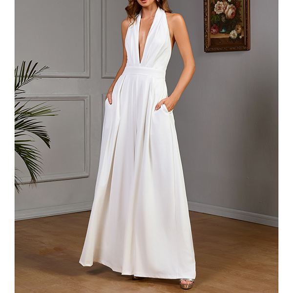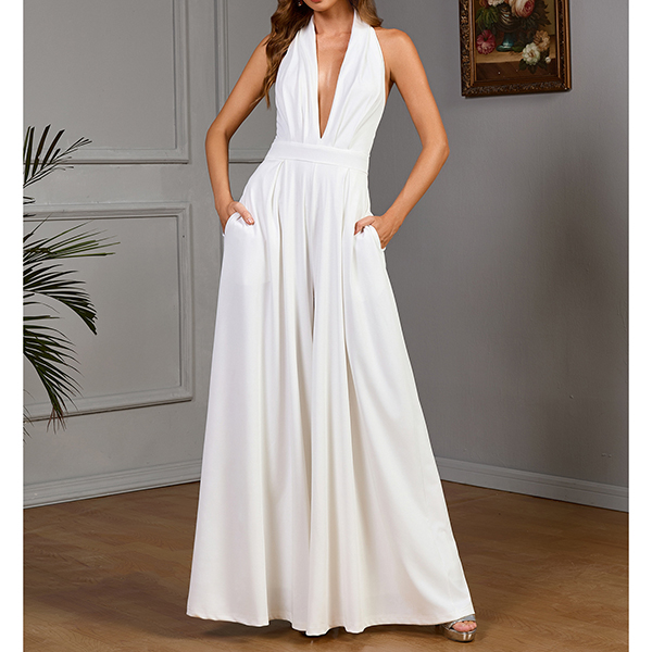 Fashion Halterneck V-neck High-rise Side Pockets Wide-leg Jumpsuit