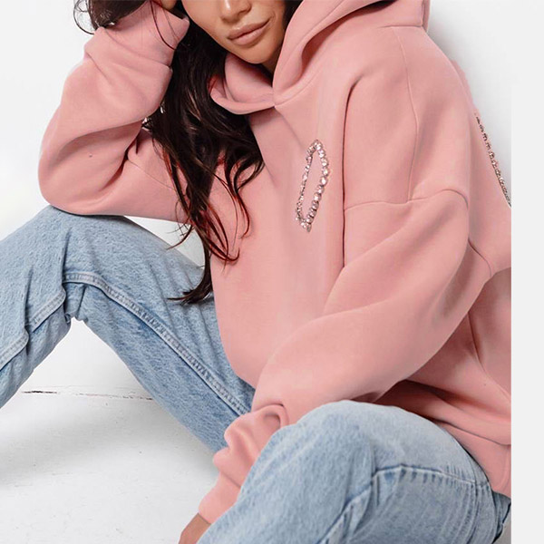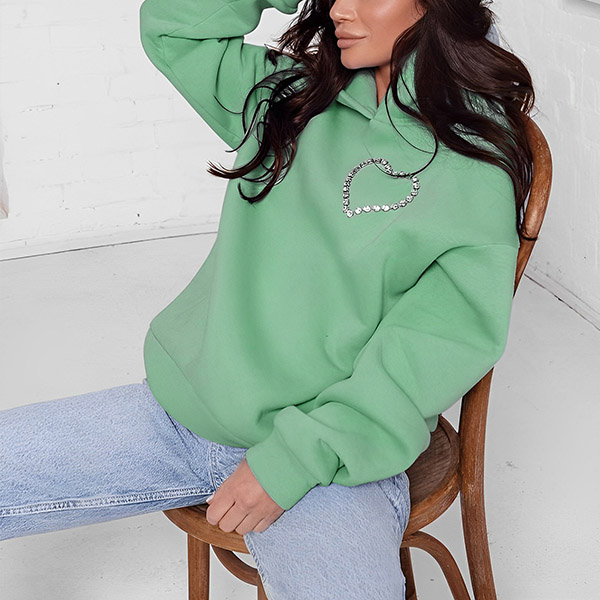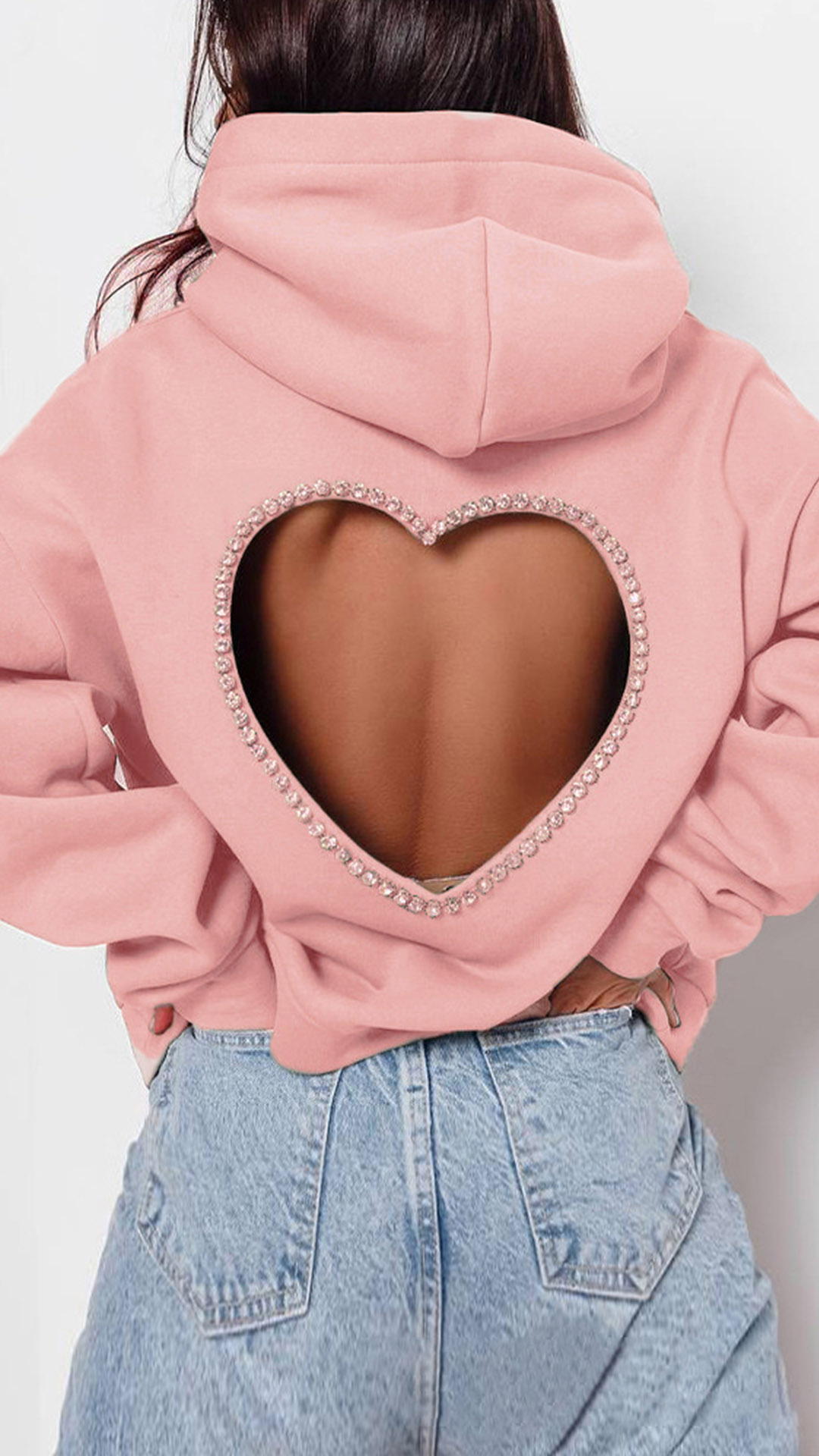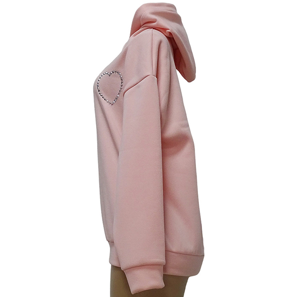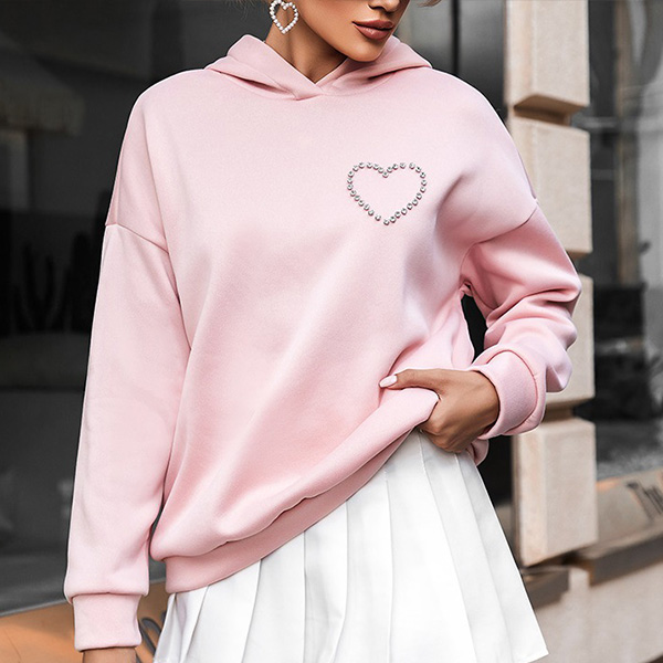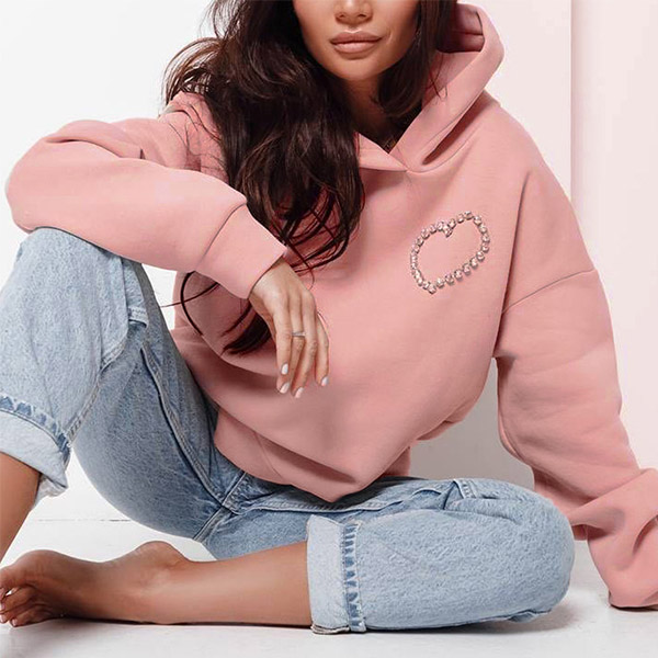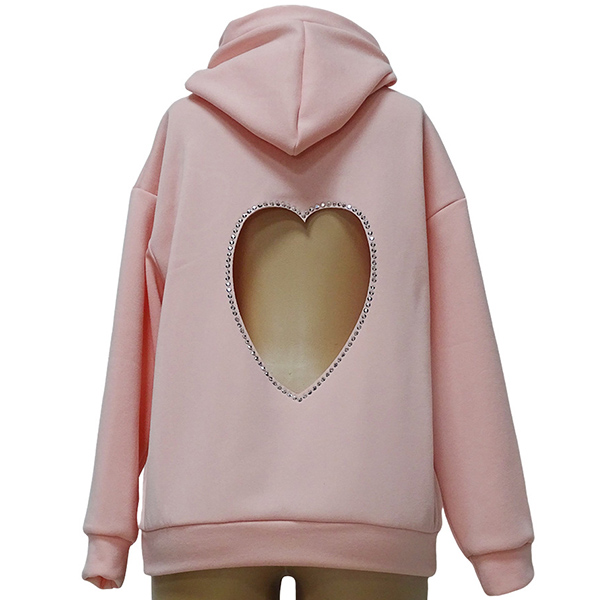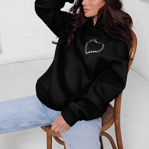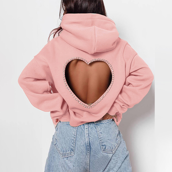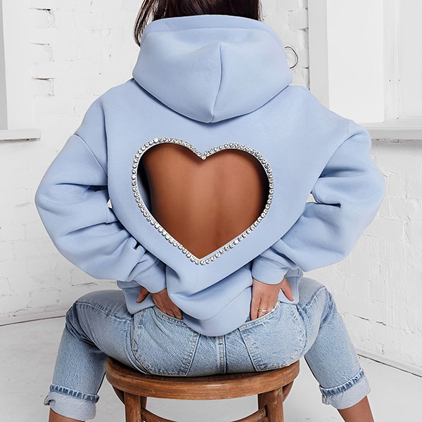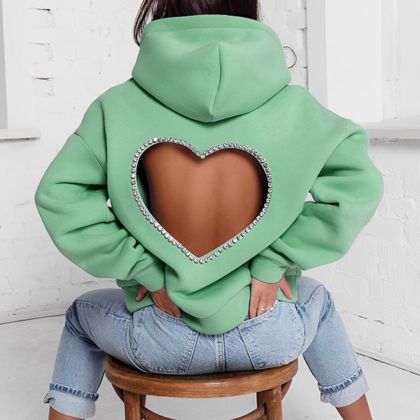 This fashion hoodie sweatshirt is perfect for showing your love for fashion. The heart cutout with rhinestone design is unique and stylish, and the hoodie style is comfortable and practical.