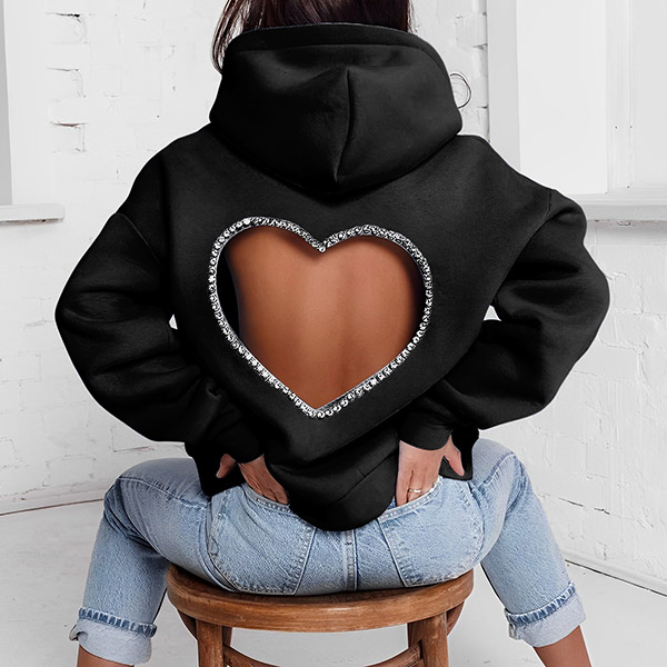 Fashion Heart Cutout Rhinestone Hoodie Sweatshirt