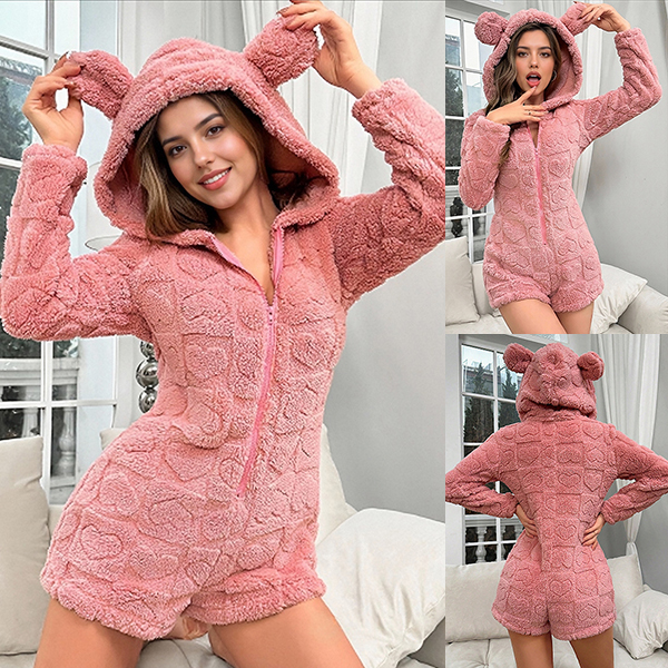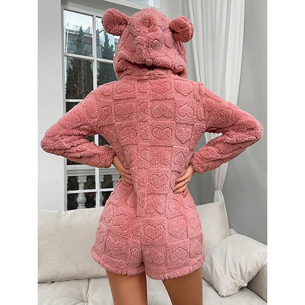 This Plush Romper is a cozy and stylish one-piece outfit that combines comfort with trendiness. The heart pattern detailing adds a cute and playful touch to the jumpsuit, creating a fun and whimsical design. The front zipper allows for easy on and off, while adding a modern and edgy element to the romper. The bear hooded feature adds a casual and laid-back vibe to the jumpsuit, offering a cozy and comfortable option for lounging or running errands.