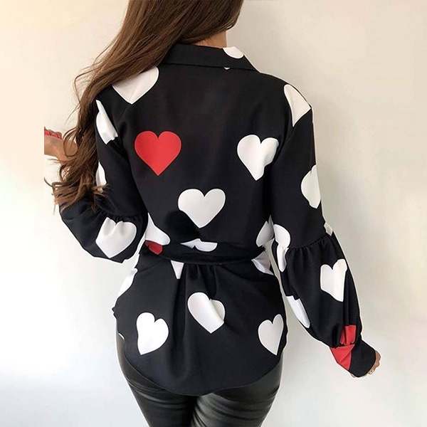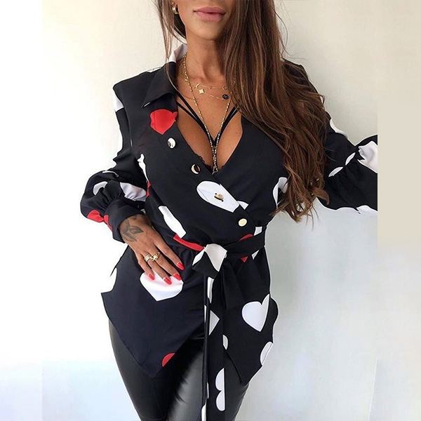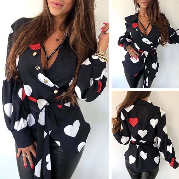 This shirt can help you upgrade your style. The hear printed pattern design lends you a dash of sweet and romantic vibes,while the v-neck and irregular design will further enhance its charm. Comes with a waist strap design,which can enrich the design style. Like it? Then invite it to your wardrobe!