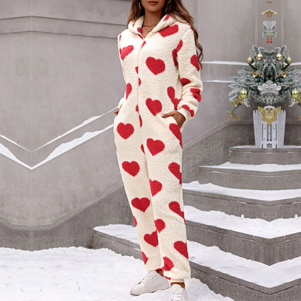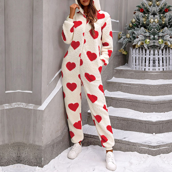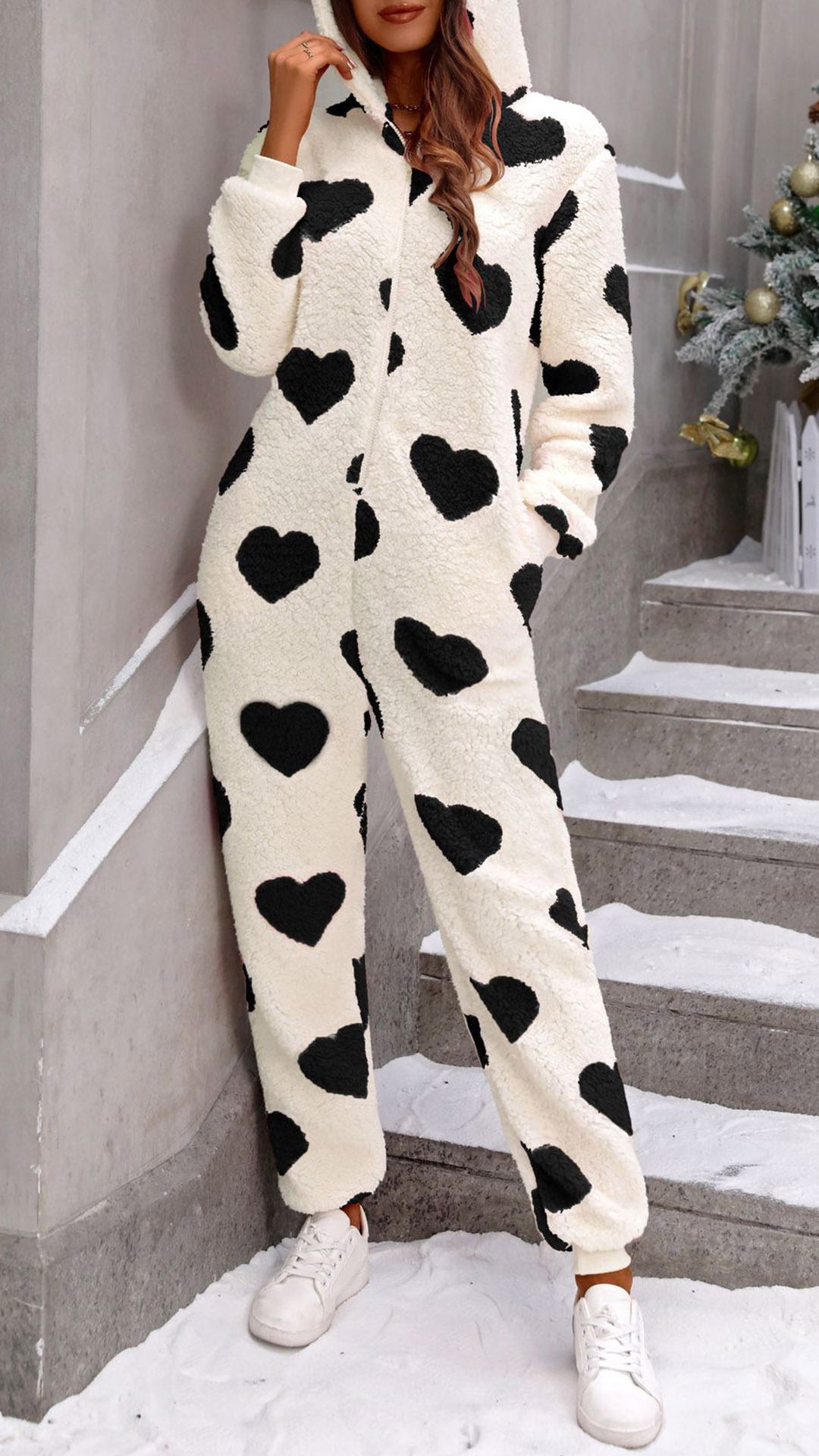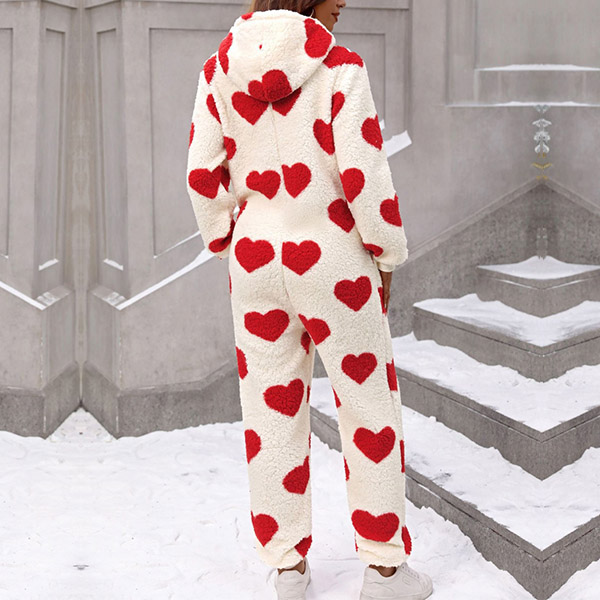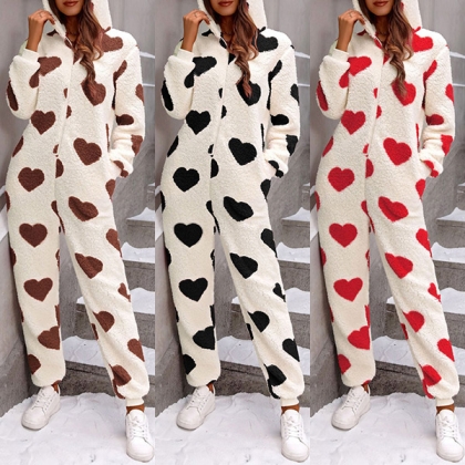 Fashion Heart Printed Plush Hooded Jumpsuit