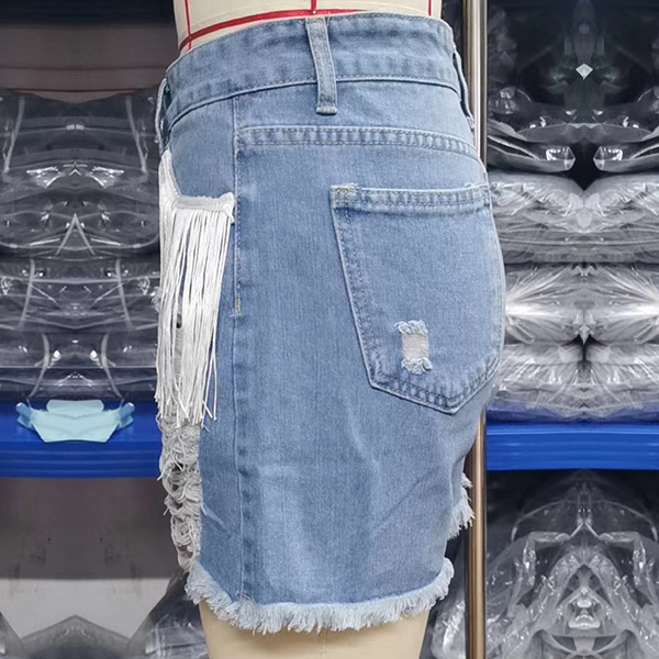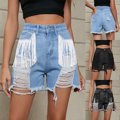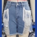 These shorts feature a distressed denim design with heavy frayed edges and tassel details, creating a unique and edgy look. Wanna have one?