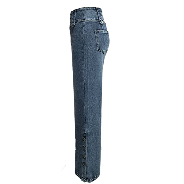 These sophisticated jeans feature flattering high-rise waistline with authentic button fly closure and dramatic side button slit detailing for contemporary denim elegance. Pair with fitted tops and sneakers for contemporary casual appeal.